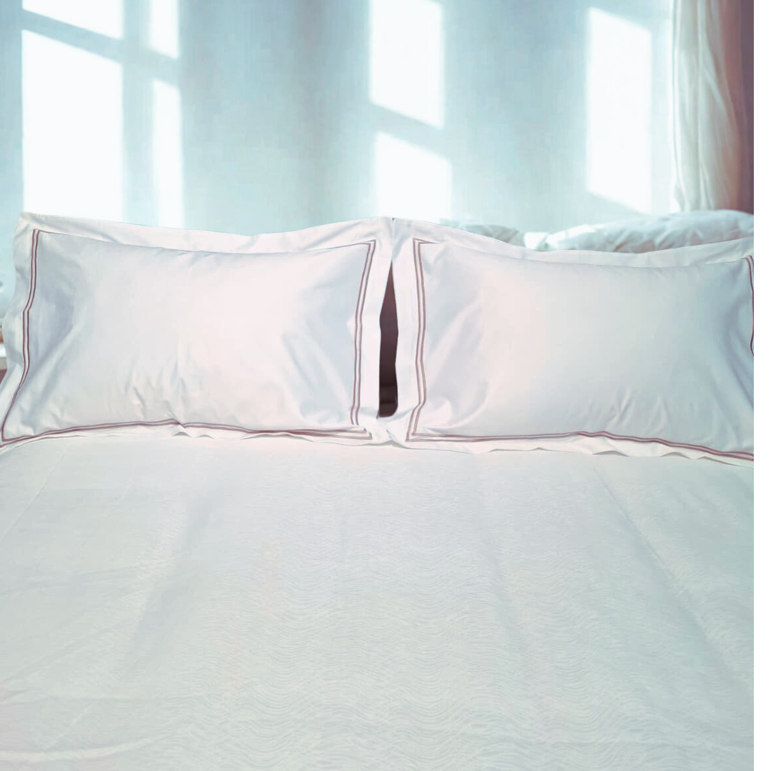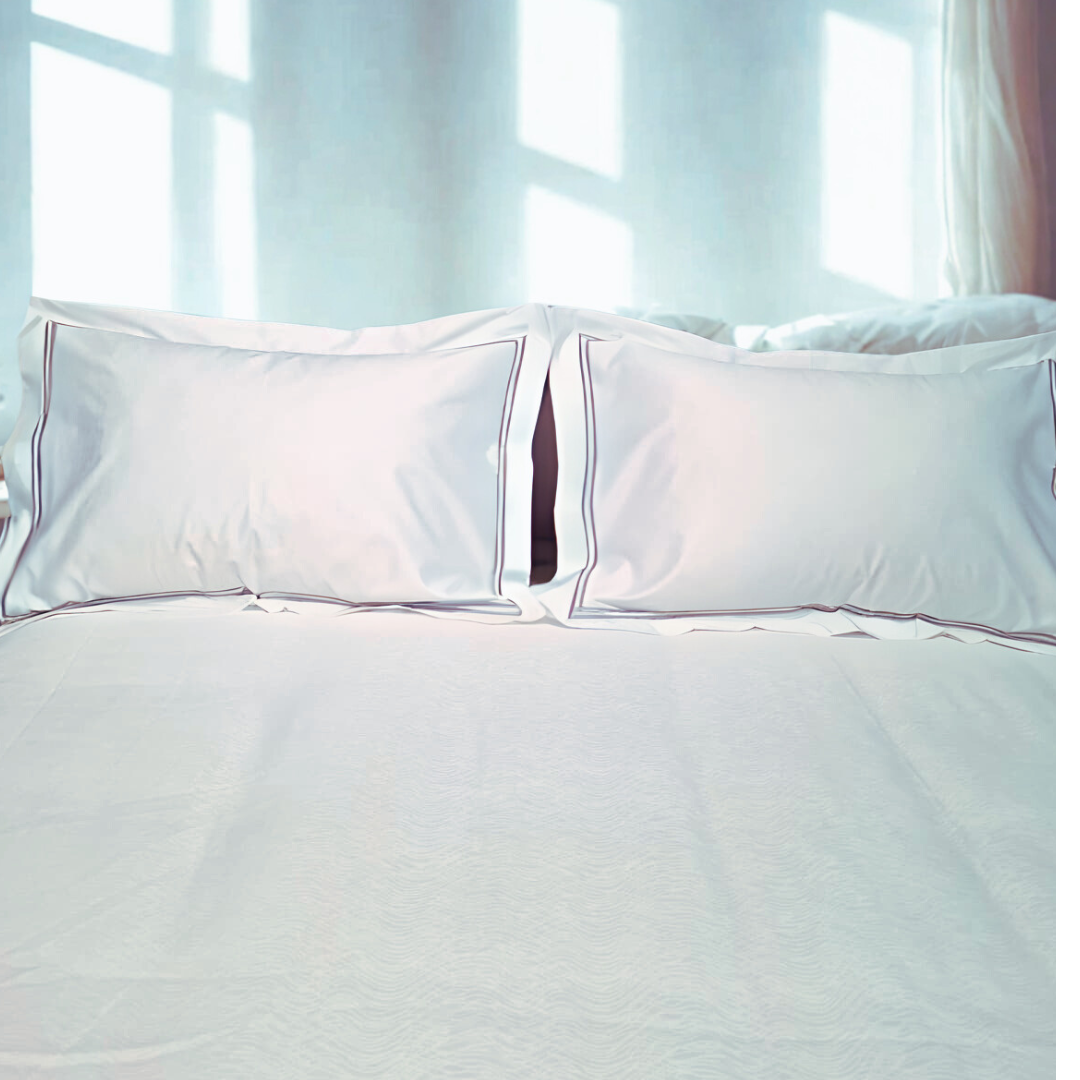 100% Superfine Cotton 500 Thread Count, Satin, White, Luxury Hotel Linen look with Double line Flange pillow covers in Grey and Beige colored Double Line Marrow